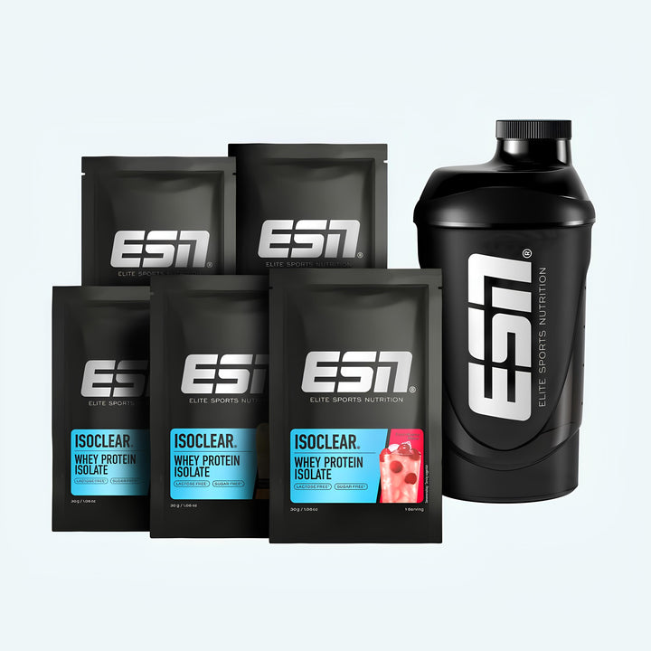 Find your whey: Mit unserem Isoclear wird es so easy wie noch nie den Körper mit Proteinen zu versorgen und die Muskeln beim Aufbau und Erhalt zu unterstützen.¹ Mit unserem Isoclear Starter Pack erlebst du klare Protein-Power in 5 erfrischend leckeren Bestseller-Sorten ohne Fett, Zucker und Laktose und hast deine Drinks dank des Shakers immer und überall dabei.²