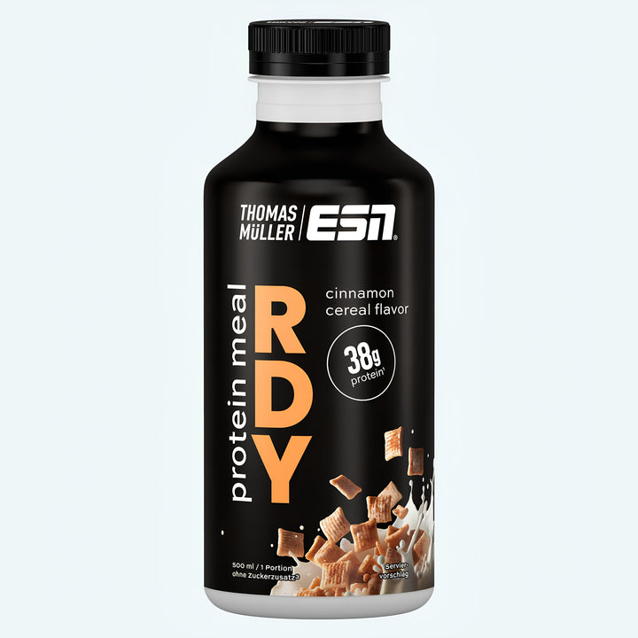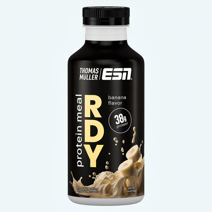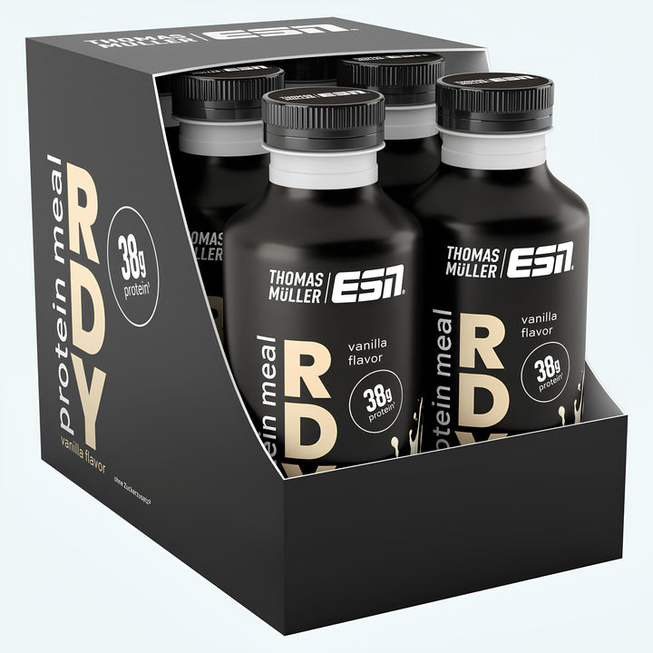Mehr als satt. RDY. Mach dich bereit für eine neue Liga der Trinkmahlzeiten: RDY Protein Meal von Fußball-Weltmeister Thomas Müller und ESN. Eine ausgewogene Mahlzeit zum Trinken mit 38g Protein, Kohlenhydraten, wertvollen Ballaststoffen, hochwertigen MCT-Ölen, 26 Vitaminen und Mineralstoffen – und leckerem Geschmack. Trinkfertig und ideal für jede Zeit und jeden Ort. Get ready.